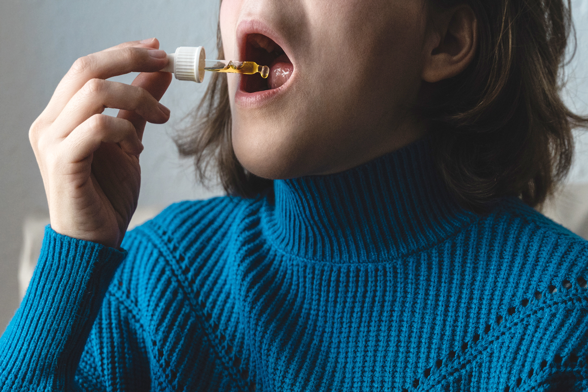 CBDオイルを舌下摂取するにはまず舌を上に持ち上げながら舌の下にCBDオイルを垂らして下さい。